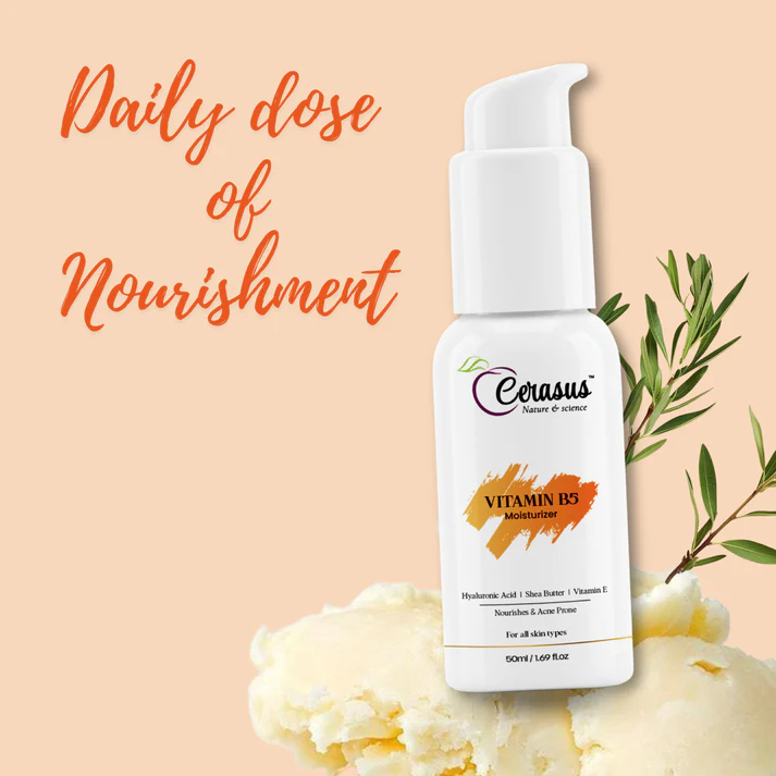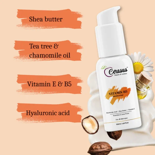 Nourish your skin deeply & keep it soft with Cerasus Vitamin B5 Moisturizer. Powered with Hyaluronic Acid, Shea Butter & Vitamin E, this lightweight formula delivers long-lasting hydration, heals dryness, and restores your skin’s natural balance. Enriched with Vitamin B5 & Niacinamide, it helps fade blemishes, smoothens uneven texture, and strengthens the skin barrier for healthier, glowing skin. Infused with Chamomile, Green Tea & Aloe Vera extracts, it calms irritation and soothes sensitive skin, making it perfect for daily use.