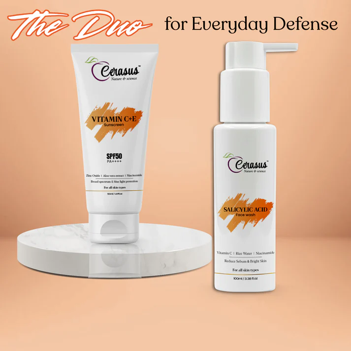 Transform your skincare routine with the Cerasus Sunscreen + Face Wash Combo, a 2-step solution designed to cleanse and protect your skin for a healthy, glowing look.