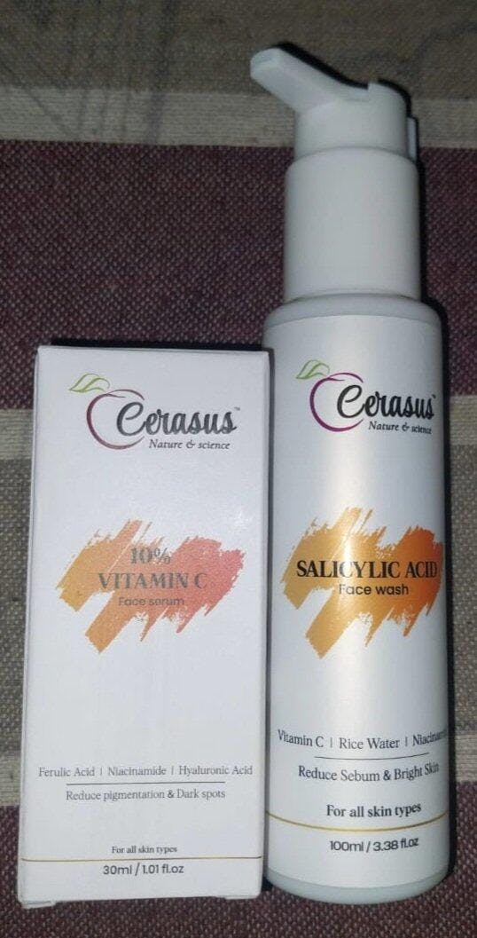 Experience clear and radiant skin with the Cerasus Face Wash & Face Serum Combo Pack. This dynamic duo works together to cleanse, brighten, and hydrate, giving your skin the daily care it deserves. The Salicylic Acid Foaming Face Wash gently removes dirt, excess oil, and impurities while Niacinamide and Rice Water refresh and energize, making it one of the best choices for glowing skin. Follow it up with the Niacinamide + Vitamin C Serum, enriched with Hyaluronic Acid, to fade dark spots, reduce uneven skin tone, and lock in lasting hydration. Lightweight, non-toxic, cruelty-free, and silicone-free, this combo keeps your skin soft, smooth, and rejuvenated every day.